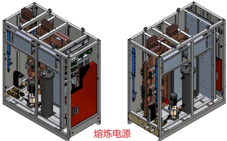 爐頭整體安裝在箱型框架上,它與水冷銅結(jié)晶器共同組成了一個密封的真空腔室。銅導(dǎo)電料桿夾緊自耗電極后,銅導(dǎo)電料桿可以提升起自耗電極,然后落下爐頭到結(jié)晶器法蘭上。自耗電極和準備工序完成并形成了真空密封環(huán)境后,即可啟動直流熔煉電源,控制系統(tǒng)自動控制自耗電極(負極)與結(jié)晶器銅底板(正極)之間的大電流電弧,在銅底板上快速形成金屬熔池。