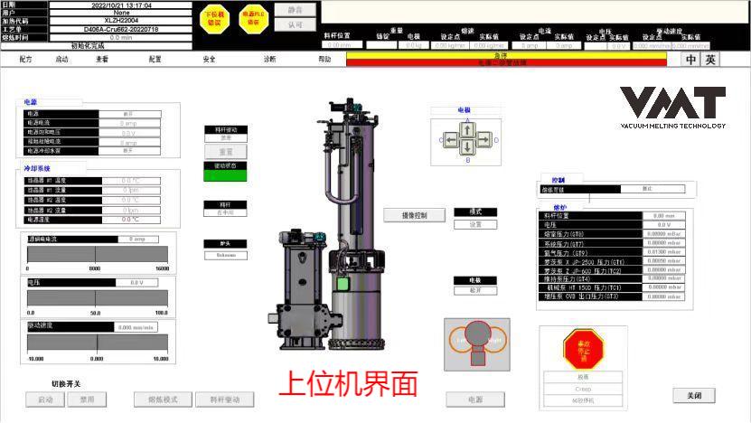 真空電弧重熔爐一般由爐頭、爐頭升降和回轉(zhuǎn)機構(gòu)、熔煉站、直流電源、短網(wǎng)系統(tǒng)、稱重系統(tǒng)、X-Y對中調(diào)節(jié)系統(tǒng)、真空系統(tǒng)、冷卻水系統(tǒng)和全自動恒熔速控制系統(tǒng)等部件組成。爐頭位于整個設(shè)備上部,導(dǎo)電料桿直接與高精度伺服驅(qū)動系統(tǒng)相連,實現(xiàn)自耗電極的上下移動。導(dǎo)電料桿在電弧熔煉過程中形成短網(wǎng)的負極。靜態(tài)熔煉站位于整個設(shè)備的下部,它由一個可吊裝的水冷銅結(jié)晶器和固定的水冷套組成,工作時結(jié)晶器是放置在一個固定的不銹鋼水冷套中。
